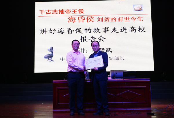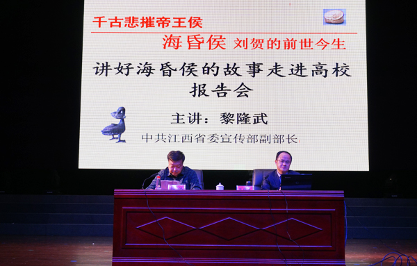 近段时期以来,南昌西汉海昏侯墓考古发现震惊世界,成为萍乡学院师生茶余饭后议论的话题,大家对刘贺其人其事产生了强烈的好奇之心。4月20日晚,省委宣传部副部长黎隆武应邀莅临我校,作题为《海昏侯刘贺的前世今生》的主旨报告会,为学校1000多名师生带来了一顿丰盛的精神大餐。院长范小林、副院长邱建丁、校领导刘卫林、宣传部部长陈永国出席报告会,副院长郭伟主持报告会。