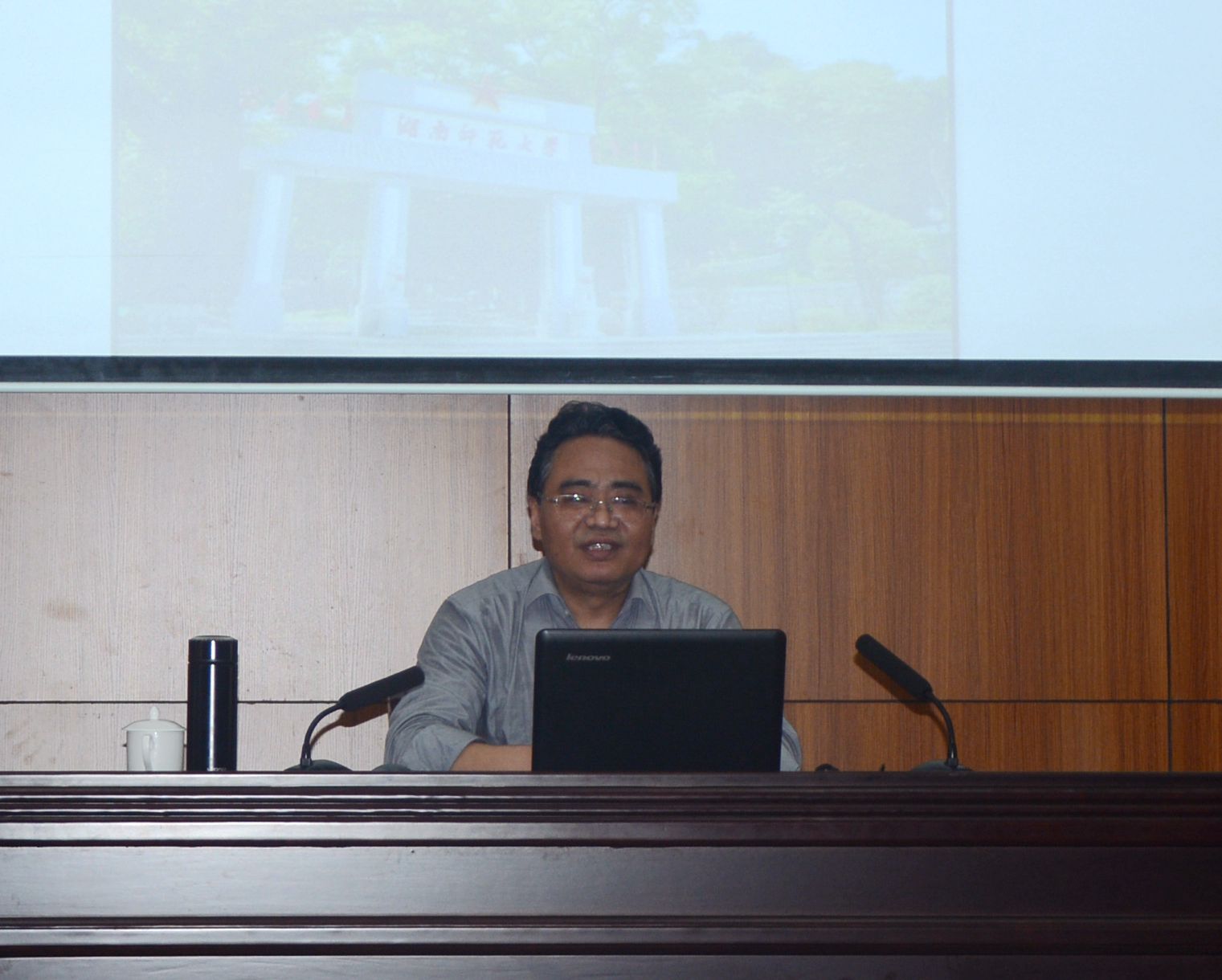 2019年4月19日下午,湖南师范大学“潇湘学者”特聘教授、博士生导师,美国研究中心常务副主任肖华锋教授应邀在至善楼学术报告厅为我校师生作题为《美国文化的全球性扩张及对中国的警示》的讲座。全校外语老师和100余名师生聆听了讲座,讲座由外国语学院院长欧阳咏梅教授主持。