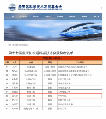 近日,詹天佑科学技术发展基金会公布第十七届詹天佑铁道科学技术奖获奖者名单,我校刘林芽教授荣获詹天佑成就奖。
