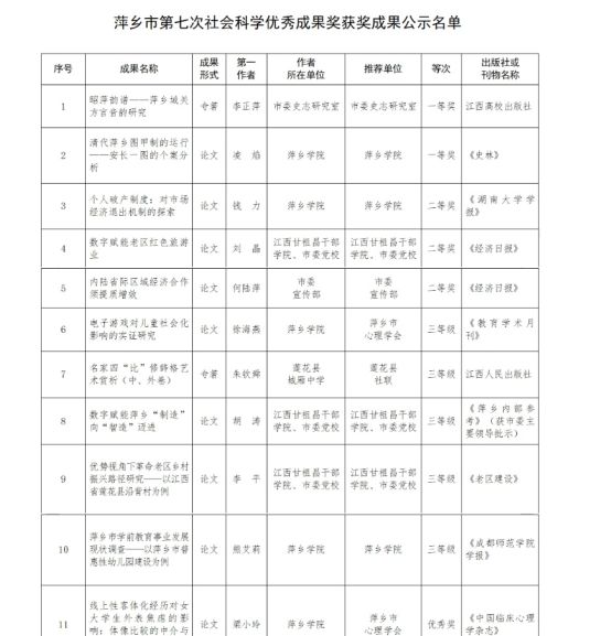 近日,萍乡市社会科学界联合会公布萍乡市第七次社会科学优秀成果奖获奖名单,我校凌焰等6位教师的学术论文获市社会科学优秀成果奖,其中凌焰老师的《清代萍乡图甲制的运行——安长一图的个案分析》荣获一等奖,钱力老师的《个人破产制度:对市场经济退出机制的探索》荣获二等奖,徐海燕和熊艾莉老师的论文荣获三等奖,梁小玲和黄明明老师的论文荣获优秀奖。