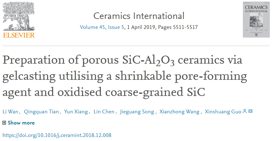 近日,我校材料与化学工程学院无机非金属材料工程专业2015级本科生万力同学为第一作者,郭新爽博士为通讯作者,萍乡学院为第一署名单位,在SCI期刊Ceramics International发表了题为“Preparation of porous SiC-Al2O3 ceramics via gelcasting utilising a shrinkable pore-forming agent and oxidised coarse-grained SiC”研究论文,Ceramics International是Elsevier数据库老牌期刊,是材料科学-硅酸盐领域SCI一区杂志,期刊影响因子IF为3.057。